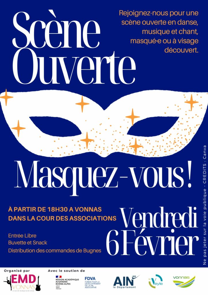 L’EMD organise une SCENE OUVERTE de Noël le mercredi 17 décembre à 18h30 dans la cour des associations de Vonnas ( Buvette et snack sur place )
