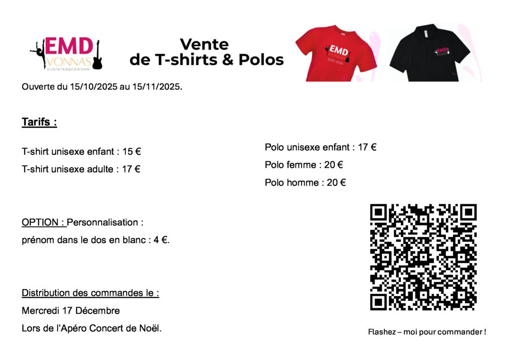 VENTE DE T-SHIRTS ET POLOS !!!! VENTE DE T-SHIRTS ET POLOS !!!! 20 octobre 2025 Rémi Comments 0 Comment L’EMD de Vonnas lance sa première vente de T-shirts et Polos aux couleurs de l’association N’hésitez pas à vous faire plaisir et à passer commande avant le 15 novembre Vous pouvez même le faire personnaliser !!!